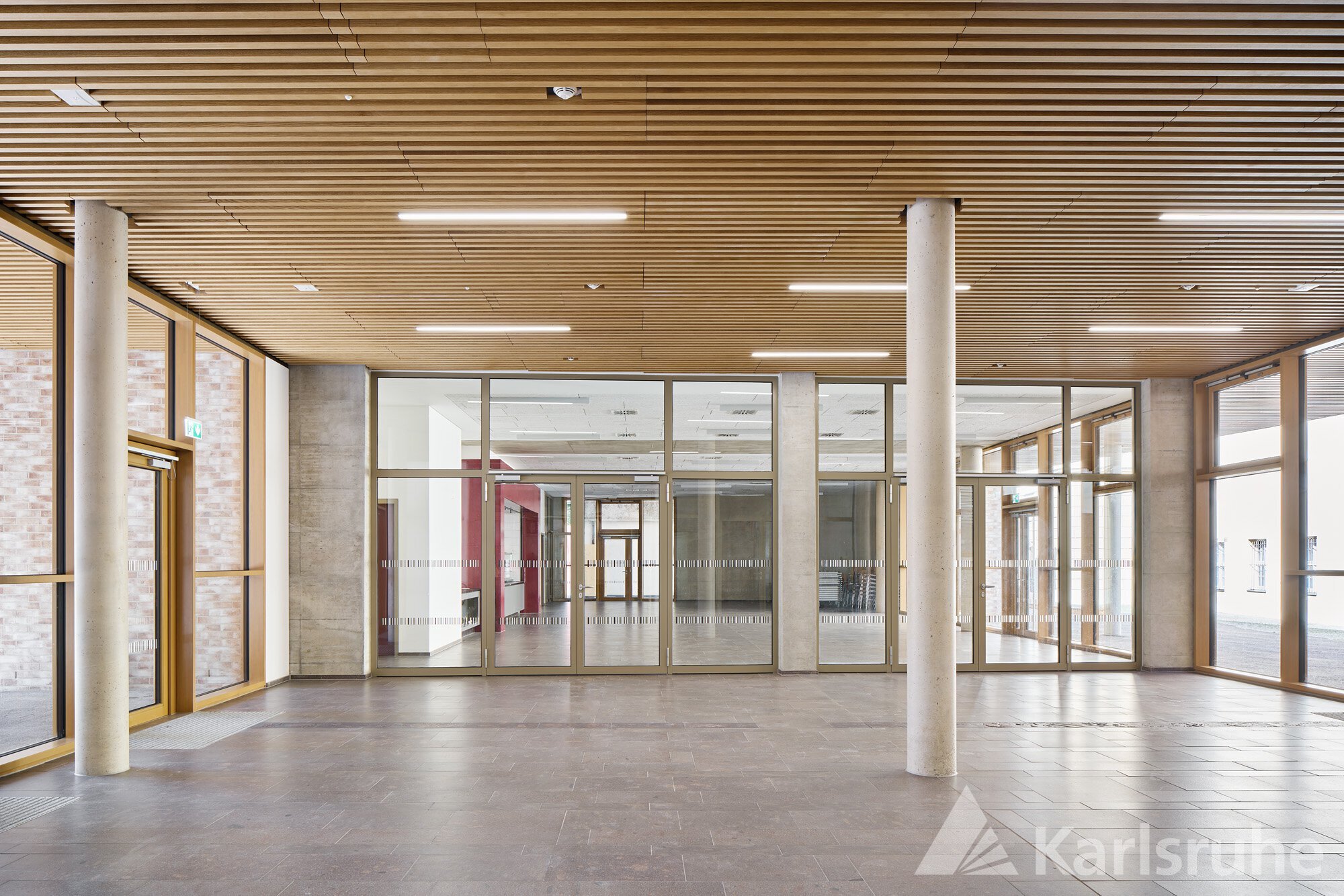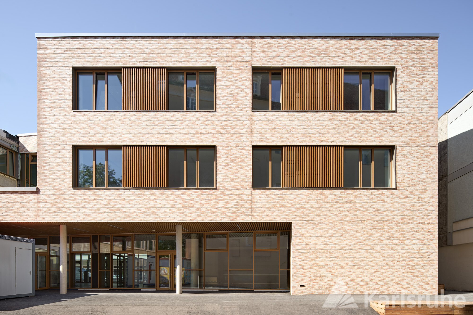 Das Fassadenkonzept mit Klinkersichtmauerwerk ist farblich auf die umgebende Bebauung abgestimmt und trägt zur Einbindung der Bauten in die Altstadt Durlach bei. Auch räumlich gingen die Architekten sensibel vor: Die Kubatur des Erweiterungsbaus ist deutlich kleiner als die vorhandene Baumasse und nimmt Bezug auf die Karlsburg. Der rückwärtige Schlosshof kommt wieder besser zur Geltung; es entsteht ein großer zusammenhängender Freiraum für den Schulhof, der mit Baumpaketen in erhöhten Pflanzbeeten mit Sitzgelegenheiten untergliedert wird.