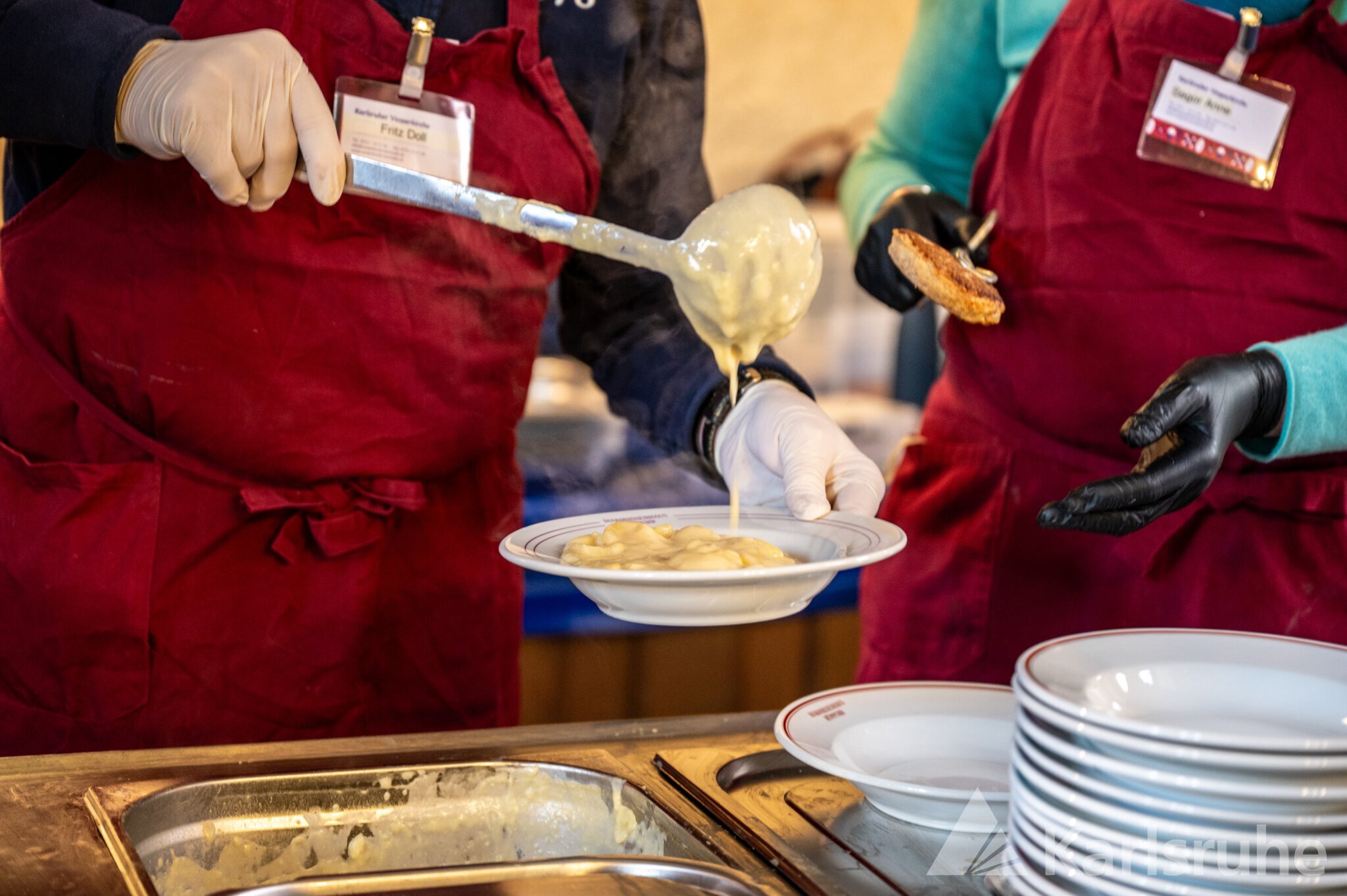 „Wir freuen uns, dass es wieder drinnen ist”, sagt Lara Pflaumbaum, die Pfarrerin der evangelischen Kirchengemeinde. In den Vorjahren war aufgrund der Kontakt-Einschränkungen die Abgabe von Speisen nur im Innenhof des Kirchenareals möglich. „Wir müssen uns alle neu sortieren, aber die Gäste genießen es, wieder sitzen zu können”, sagt die Geistliche. Das Kirchenschiff ist vier Wochen lang in Sitzreihen eingeteilt, wobei der Kirchenboden vorübergehend zum Schutz mit Spanplatten belegt wurde.