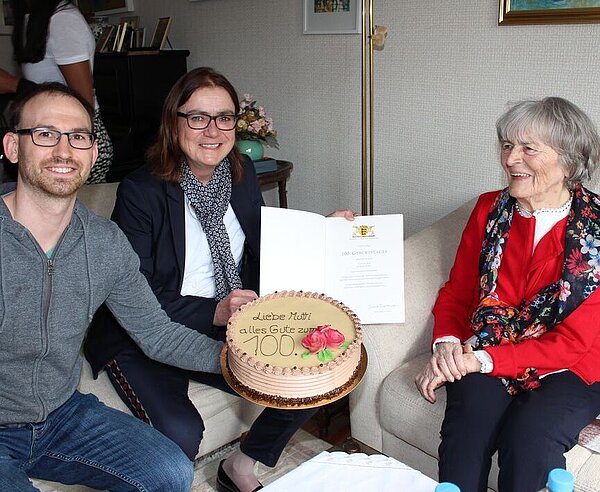 Immer wieder klingelt das Telefon, die rüstige Dame nimmt sich für jede Gratulation Zeit, während sich die Gäste an der Tarte gütlich tun. Schnell kommt noch der Konditor vorbei und bringt die Geburtstagstorte. Was das Geheimnis für ein langes, glückliches Leben ist? „Ach, ich habe mich immer mit positiven, freundlichen Menschen umgeben. Außerdem habe ich auf Medikamente verzichtet“, sagt die lebenslustige Jubilarin gut gelaunt. „Die gute Durlacher Luft hat sicher auch nicht geschadet“, merkt Ortsvorsteherin Alexandra Ries launig an, die Glückwünsche von Stadt und Land mit Urkunde und Blumen überreichte. Aus Ibeles erster Ehe gingen zwei Kinder hervor, aus der zweiten mit dem Kunstmaler Sepp Ibele, der 1997 verstarb, ein weiteres. Heute darf sie sich über fünf Enkel und vier Ur-Enkel freuen. Für Kultur, Musik und Ausstellungen hat sich die Durlacherin, die unweit der Karlsburg noch in ihrer Wohnung lebt, seit jeher interessiert. Zeichnen mochte sie ebenfalls – „und natürlich das Turmbergbad“. -voko-