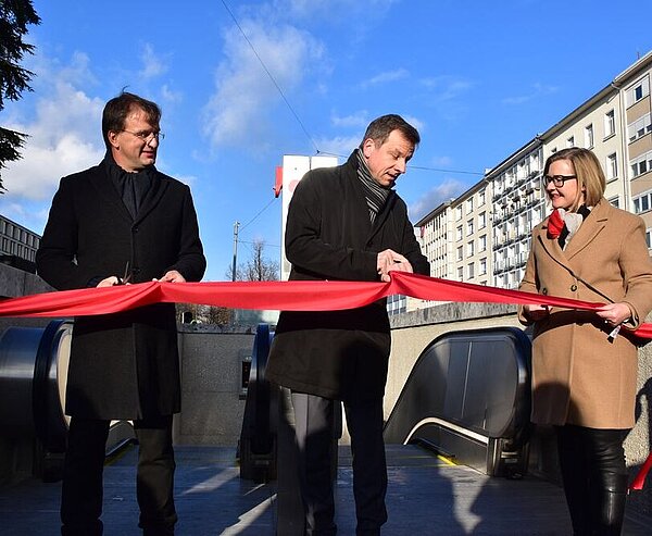 Es ist noch nicht mal 14 Uhr, doch die drei Halltestellen-Paten zählen mit den Zuschauern bereits den Countdown von zehn runter, zerschneiden das rote Band und bejubeln die offizielle Eröffnung der U-Haltestelle Kongresszentrum. Dann fahren sie als erste die Rolltreppe hinab.