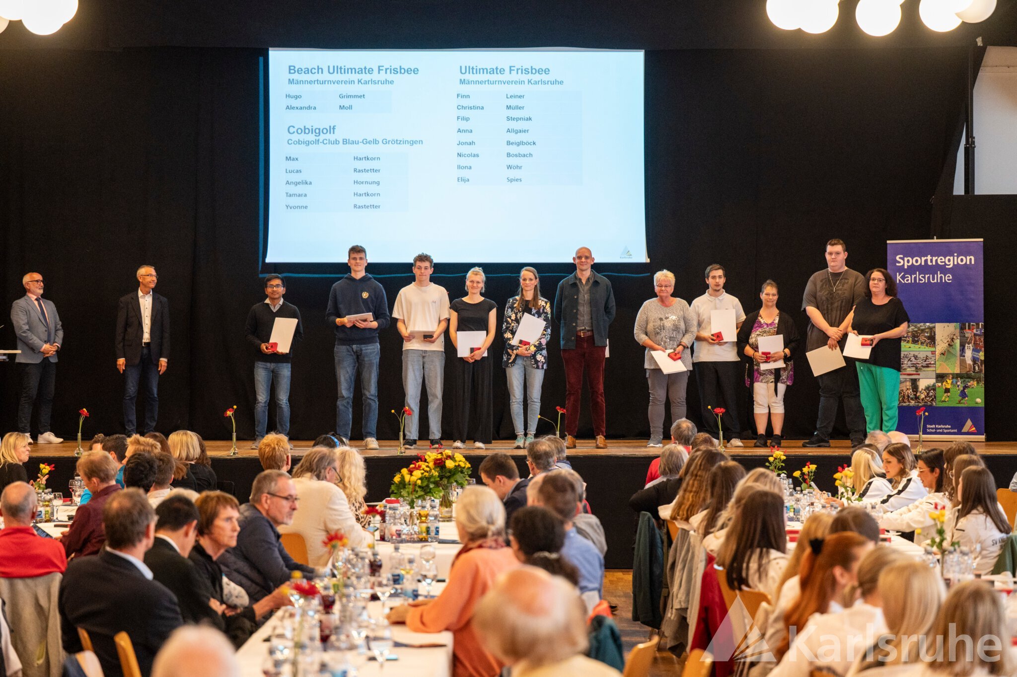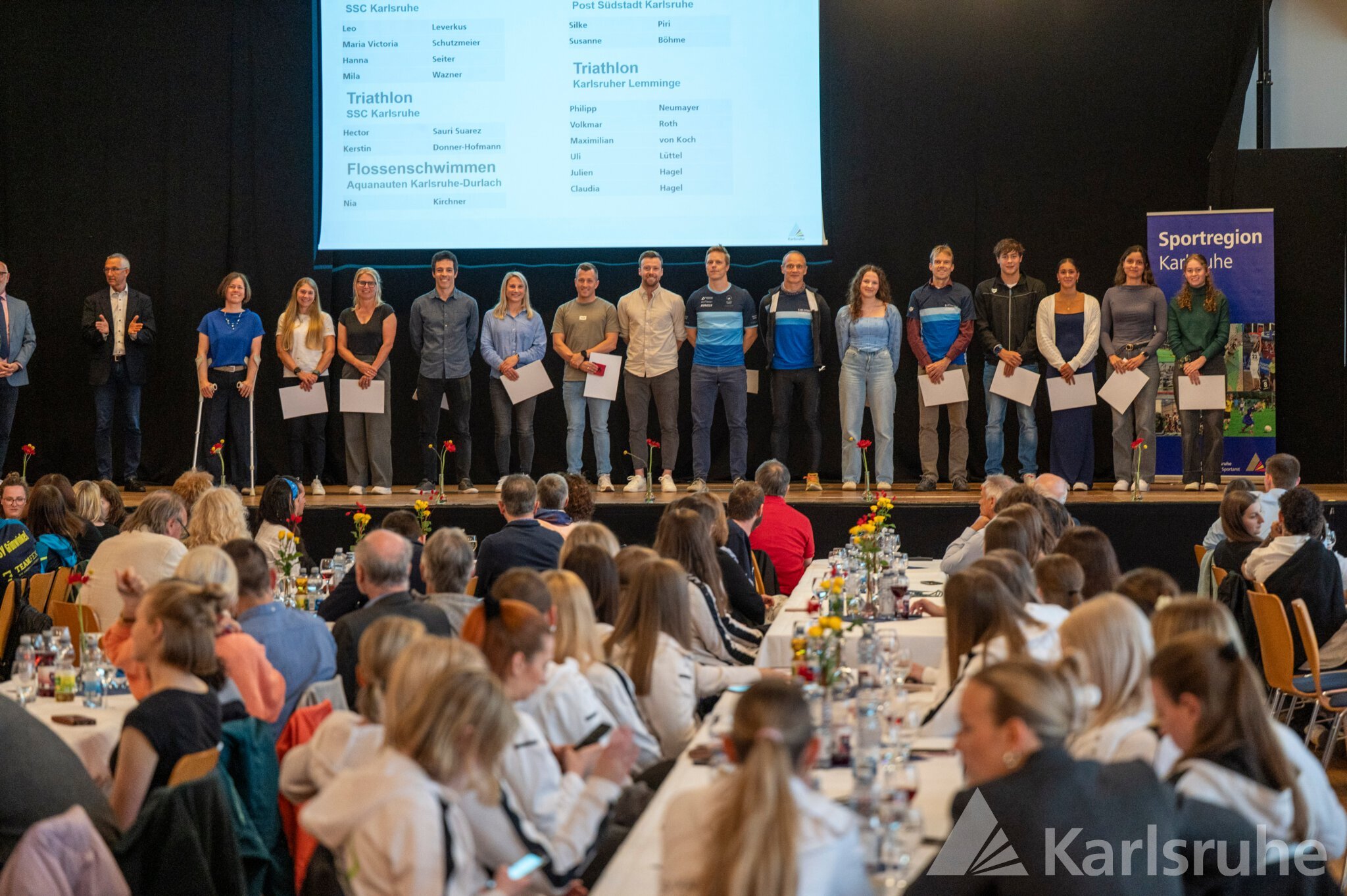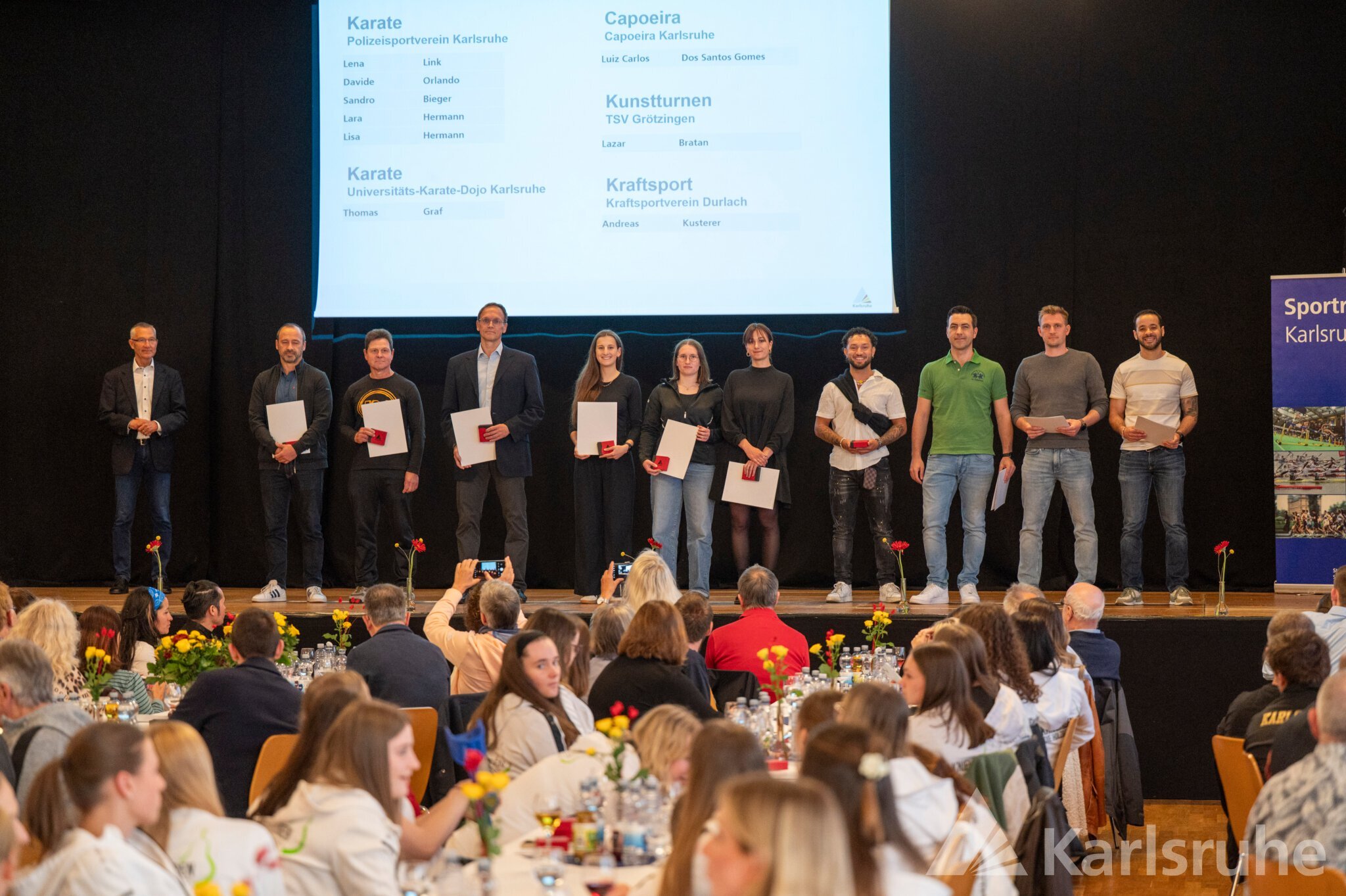 Umrahmt von den sportlichen Einlagen der Fliedergarde der Mühlburger Carnevals Gesellschaft und der EW Wushu Academy, die traditionelle chinesische Kampfkunst präsentierte, durften sich Sportlerinnen und Sportler aus 31 Karlsruher Vereinen über die Würdigung durch ihre Heimatstadt freuen. Ob Finswimming, Orientierungslauf, Cobigolf, Capoeira oder Modellflug – die Vielseitigkeit der Karlsruher Sportlandschaft trat deutlich zutage. Bürgermeister Dr. Martin Lenz und Hartmut Allgeier, der Leiter des Schul- und Sportamts, durften Sportler wie die Höhenbergsteigerin Flor Cuenca Blas für das Bezwingen von elf 8 000ern ohne Sauerstoff und den Kraftsportler Andreas Kusterer für seinen Weltmeistertitel im Reißen, Stoßen und Zweikampf ebenso ehren wie „alte Bekannte“. So waren unter anderem die Rheinbrüder im Kanurennsport, die Leichtathleten der LG Region, die Sportschützen (Schützenclub Mühlburg, SSV Daxlanden, GSV Karlsruhe) und Ruderer der Vereine Wiking und Rheinklub Alemannia wie in den Vorjahren stark vertreten. Aber auch in den Bereichen Triathlon, Kegeln, Basketball, Schach, Karate und Ultralauf wurden wieder zahlreiche Medaillen und Urkunden verteilt.