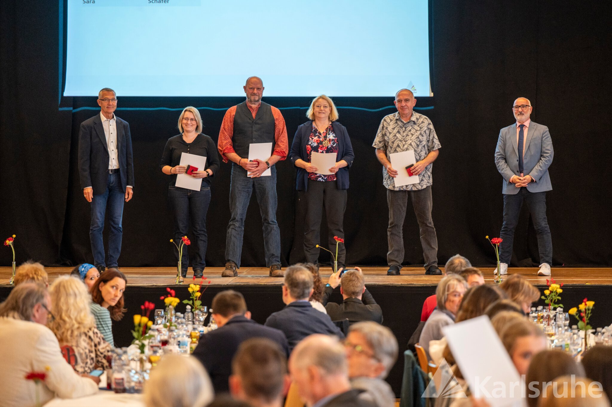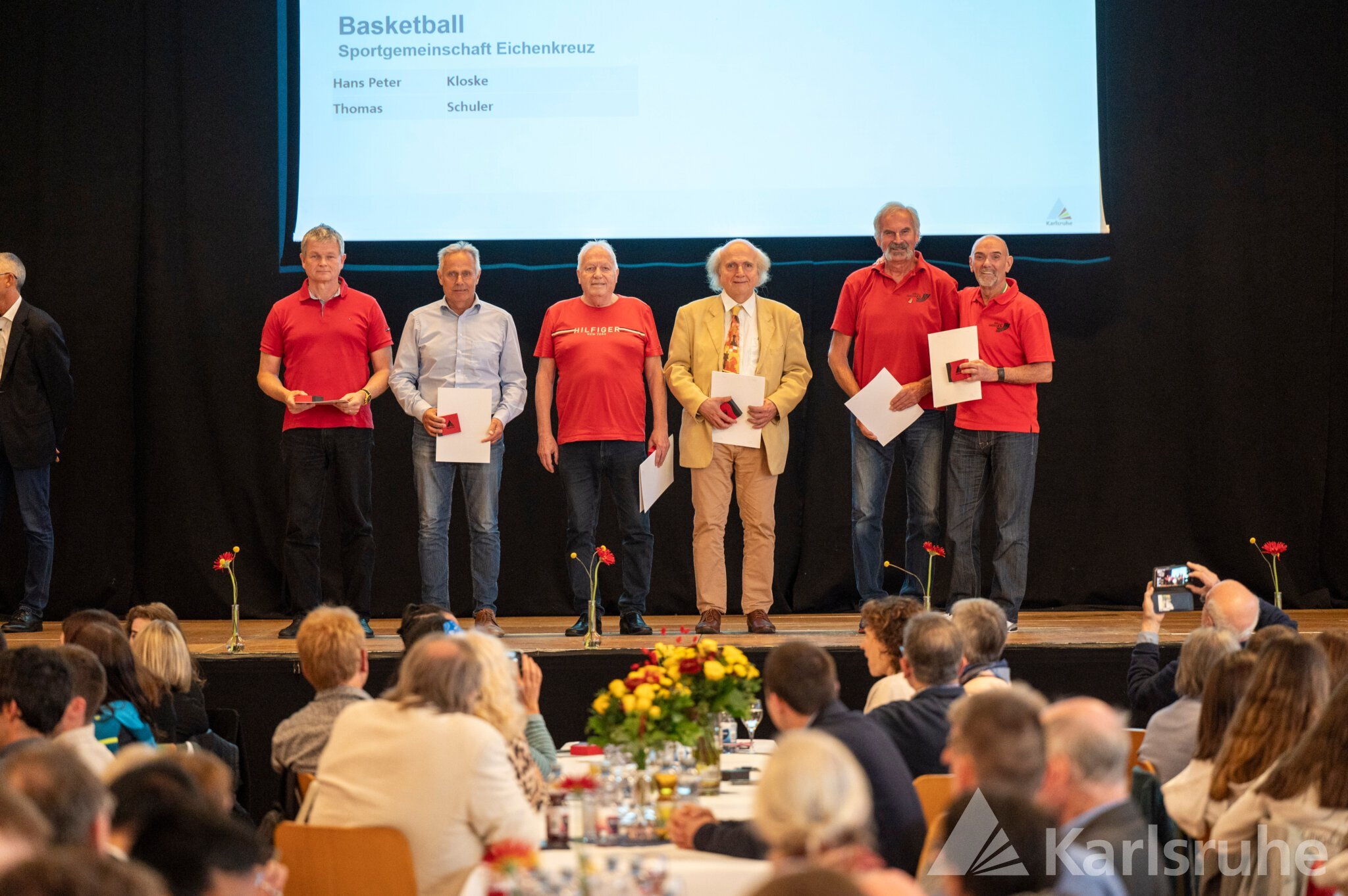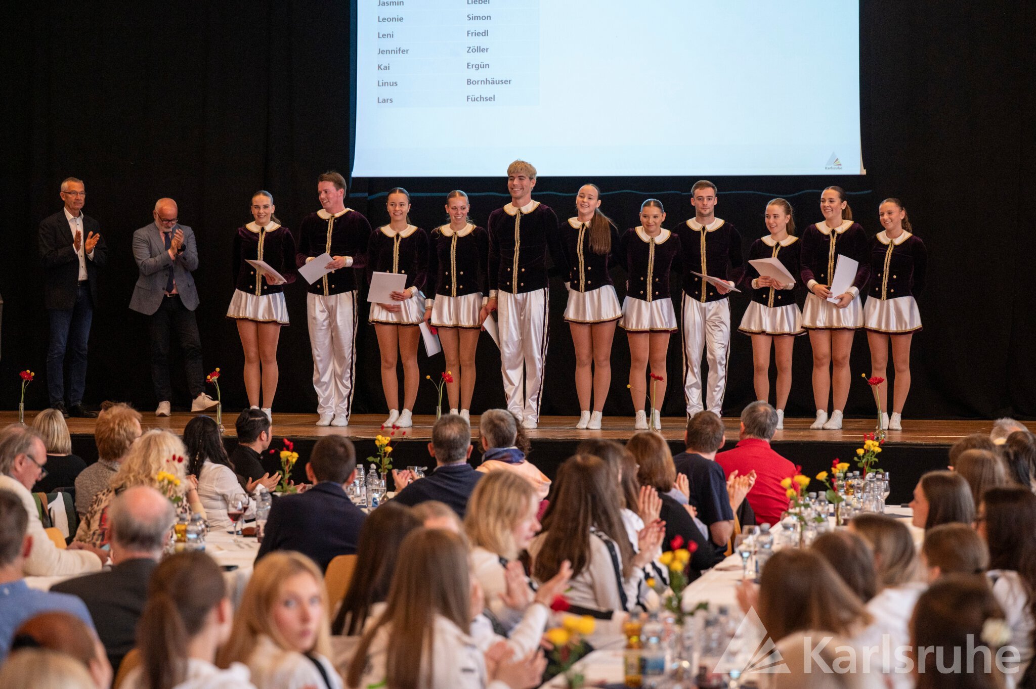 Umrahmt von den sportlichen Einlagen der Fliedergarde der Mühlburger Carnevals Gesellschaft und der EW Wushu Academy, die traditionelle chinesische Kampfkunst präsentierte, durften sich Sportlerinnen und Sportler aus 31 Karlsruher Vereinen über die Würdigung durch ihre Heimatstadt freuen. Ob Finswimming, Orientierungslauf, Cobigolf, Capoeira oder Modellflug – die Vielseitigkeit der Karlsruher Sportlandschaft trat deutlich zutage. Bürgermeister Dr. Martin Lenz und Hartmut Allgeier, der Leiter des Schul- und Sportamts, durften Sportler wie die Höhenbergsteigerin Flor Cuenca Blas für das Bezwingen von elf 8 000ern ohne Sauerstoff und den Kraftsportler Andreas Kusterer für seinen Weltmeistertitel im Reißen, Stoßen und Zweikampf ebenso ehren wie „alte Bekannte“. So waren unter anderem die Rheinbrüder im Kanurennsport, die Leichtathleten der LG Region, die Sportschützen (Schützenclub Mühlburg, SSV Daxlanden, GSV Karlsruhe) und Ruderer der Vereine Wiking und Rheinklub Alemannia wie in den Vorjahren stark vertreten. Aber auch in den Bereichen Triathlon, Kegeln, Basketball, Schach, Karate und Ultralauf wurden wieder zahlreiche Medaillen und Urkunden verteilt.