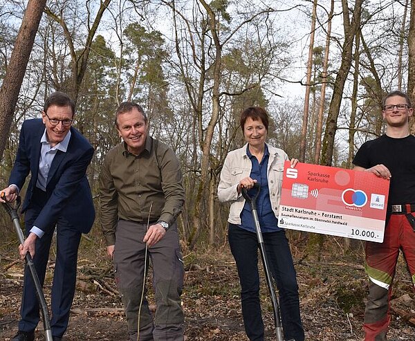 Bürgermeisterin und Forstdezernentin Bettina Lisbach freute sich über die „tolle Spende“. Der Vorstandsvorsitzende der Sparkasse Karlsruhe, Michael Huber, zeigte den Hintergrund der Spende auf: „Die Sparkasse feiert in diesem Jahr ihr 210-jähriges Bestehen. Wie bei vergangenen Jubiläen wollten wir gerne wieder Bäume spenden.“