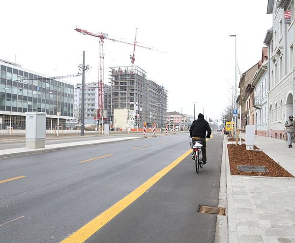 Eine solche Breite erlaubt auch sichere Überholvorgänge. Am Knotenpunkt Kriegsstraße/Brauerstraße biegen Fahrradfahrende indirekt links ab, weitere direkte Rechts- und indirekte Linksabbieger will das Stadtplanungsamt prüfen. Auch zu Fuß ergeben sich durch die Pläne keine größeren Umwege mehr: So zeigen die Vorplanungen zwei Querungen für den Fuß- und Radverkehr an Hirsch- und Leopoldstraße.