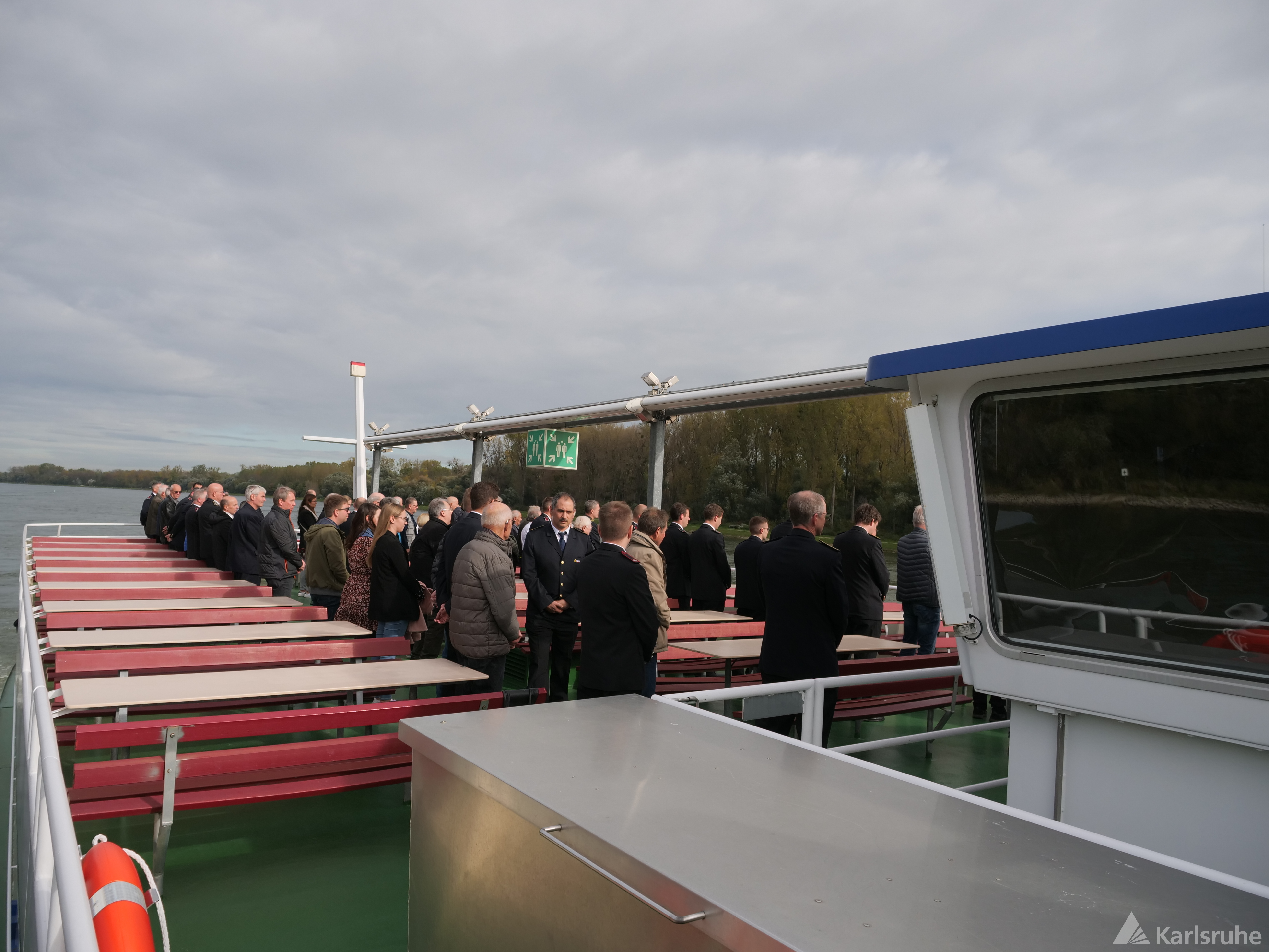 Es wurde ein Kranz am Gedenkstein niedergelegt und zuvor ein Gottesdienst auf der MS Karlsruhe abgehalten.