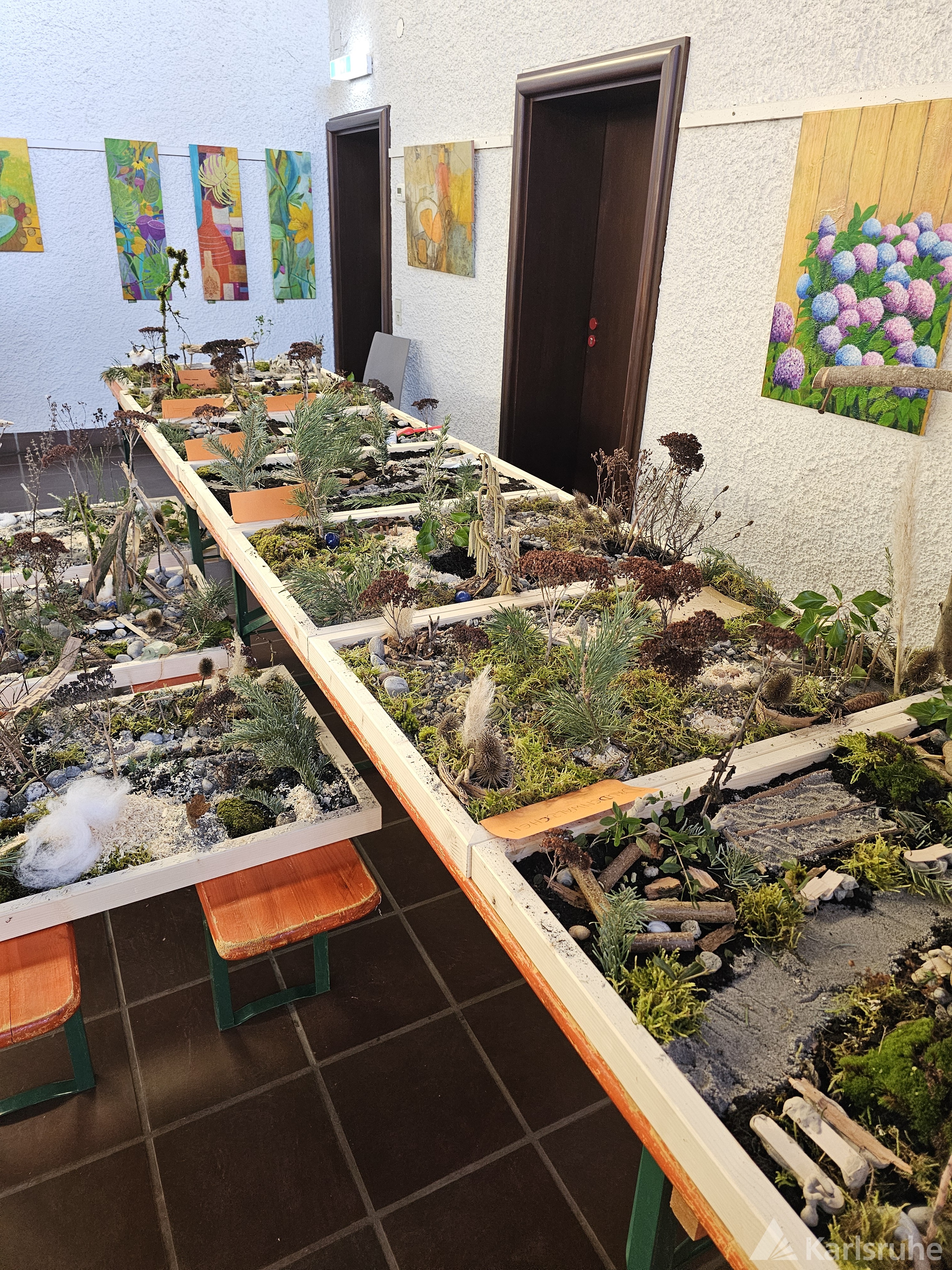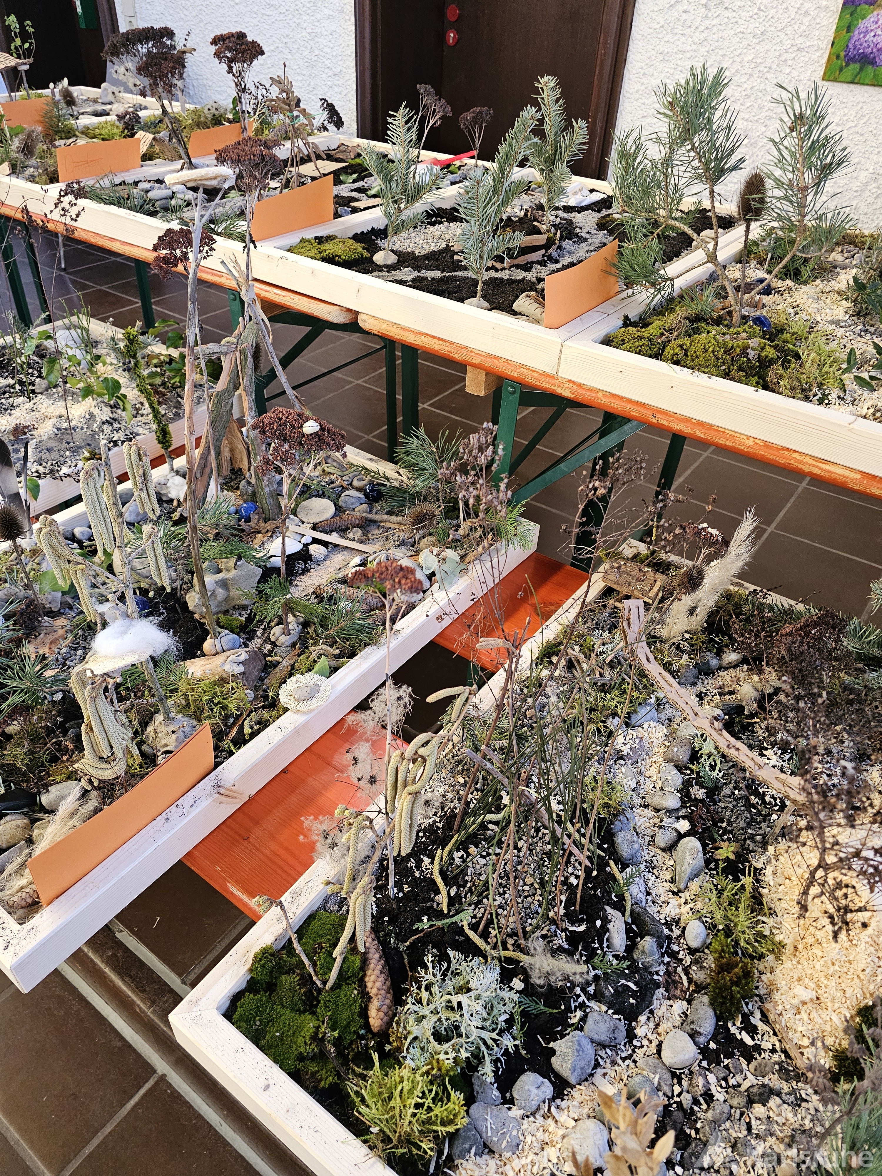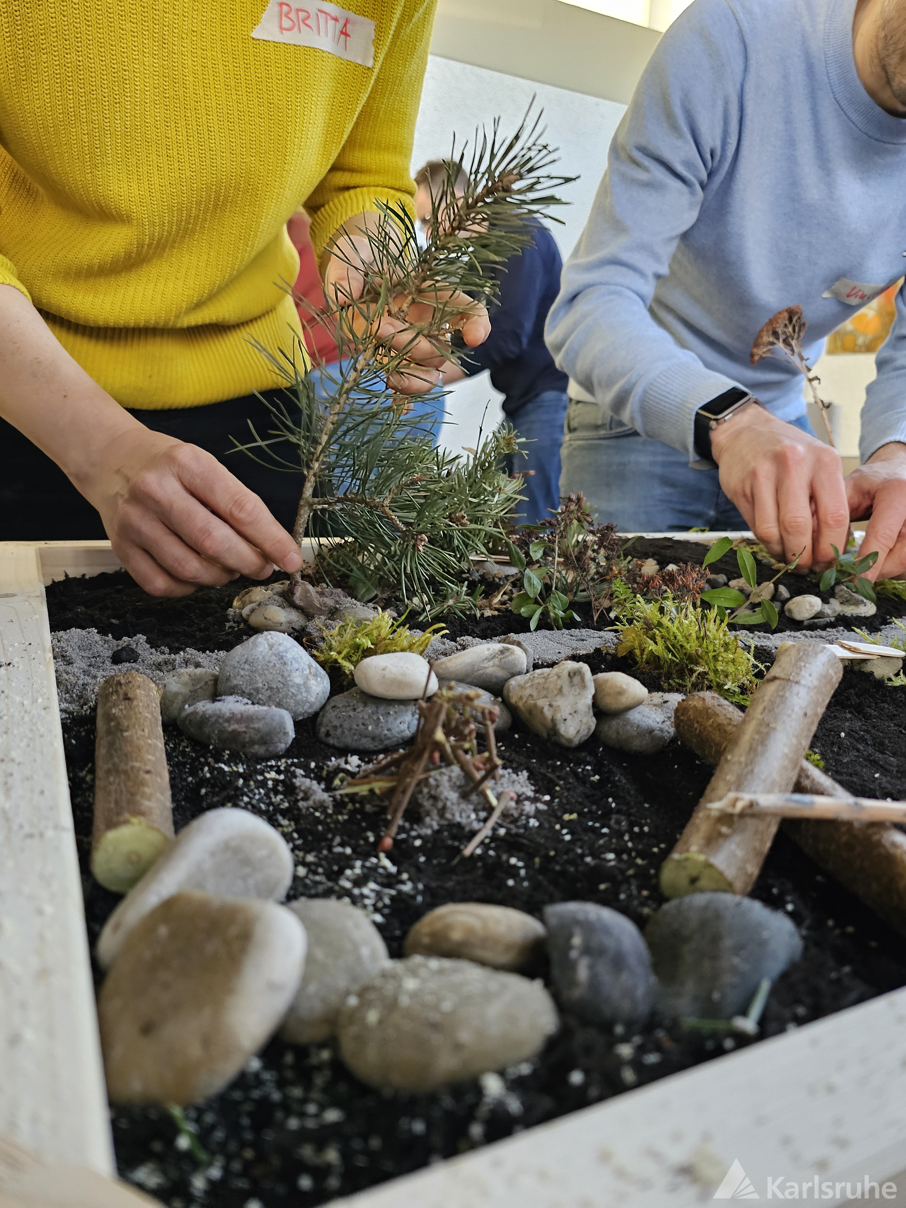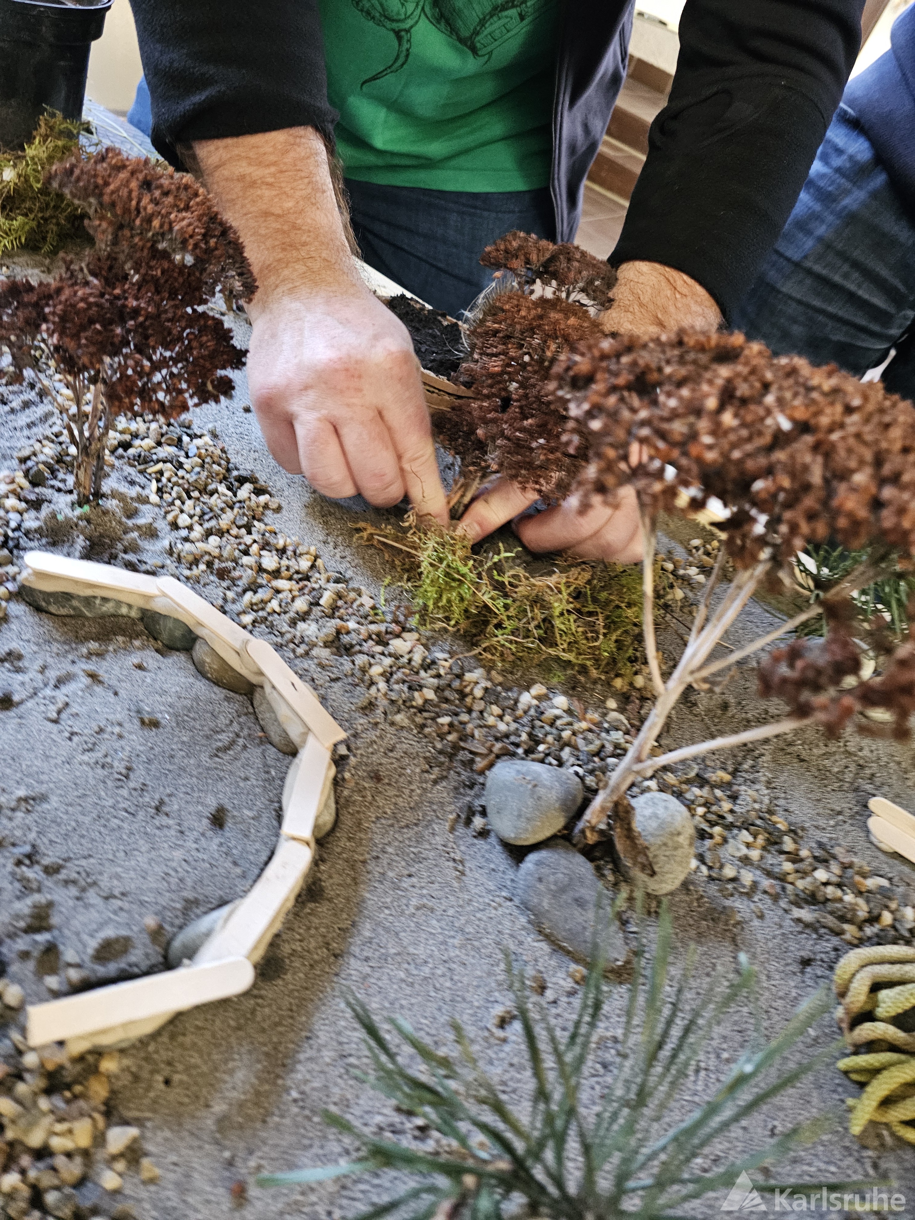 Ausgestattet mit vielfältigen Naturmaterialien wie Sand, Kies, Erde, Ton, kleinen Zweigen sowie weiteren Bastel- und Gestaltungsmaterialien erarbeiteten die Teilnehmenden in bunt gemischten Kleingruppen anschauliche Modelle.