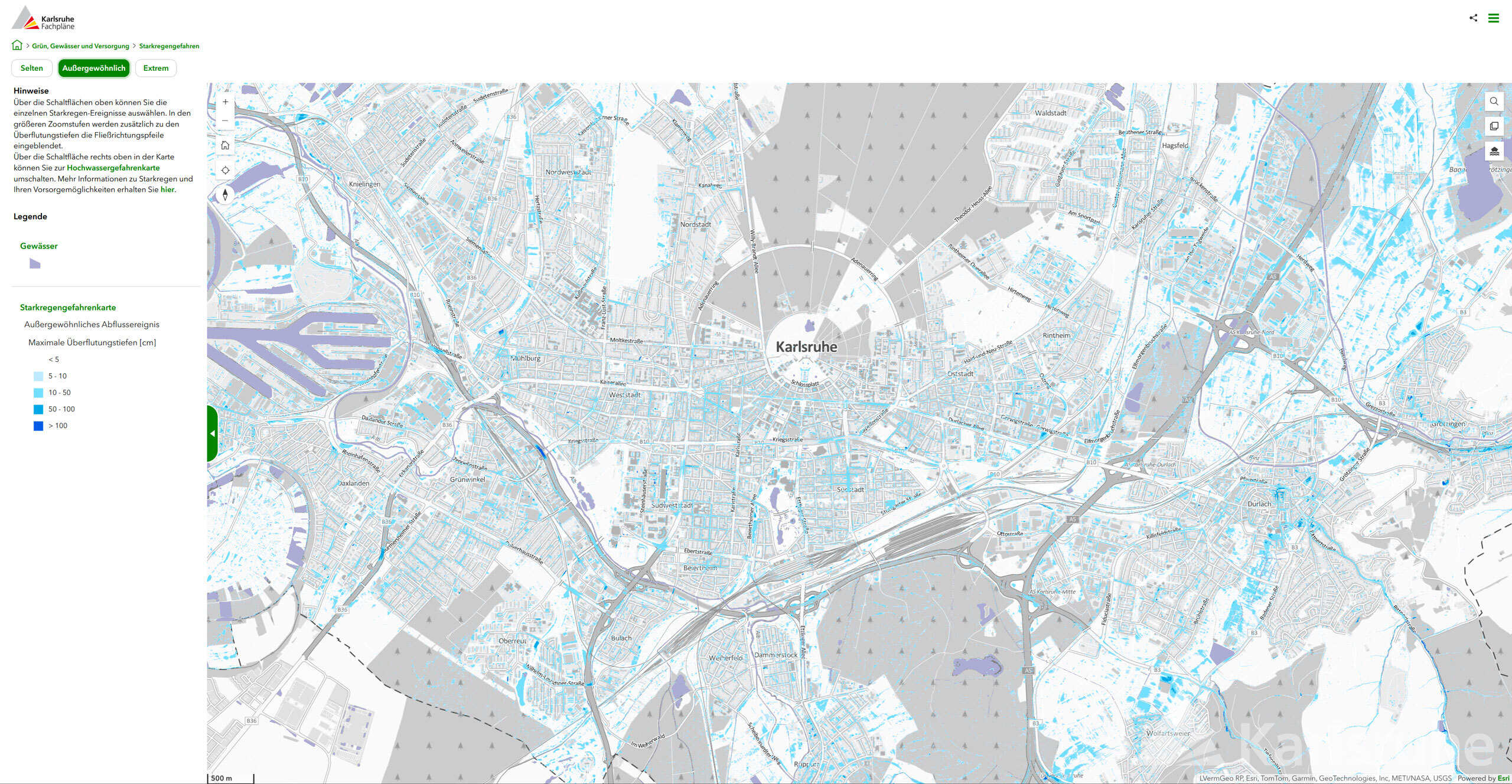 Im Folgenden finden Sie Hinweise zur Nutzung der Starkregengefahrenkarten im Geodatenportal der Stadt Karlsruhe.