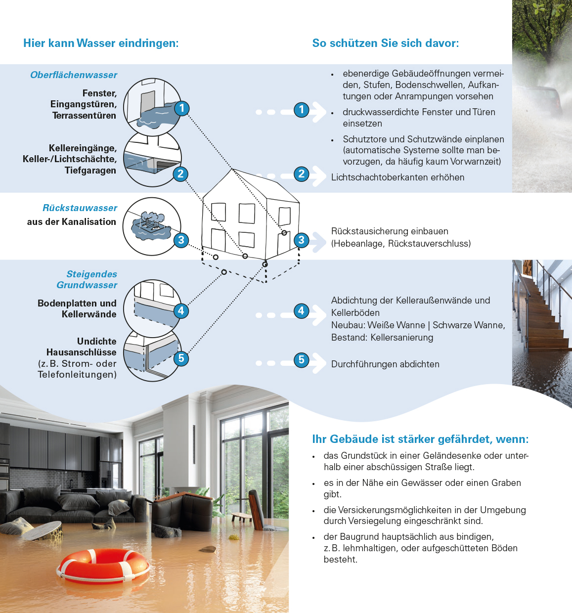 Im Folgenden finden Sie einige Hinweise auf Möglichkeiten der privaten Vorsorge gegen Starkregen. Detaillierte Informationen finden Sie unter der Linkliste.